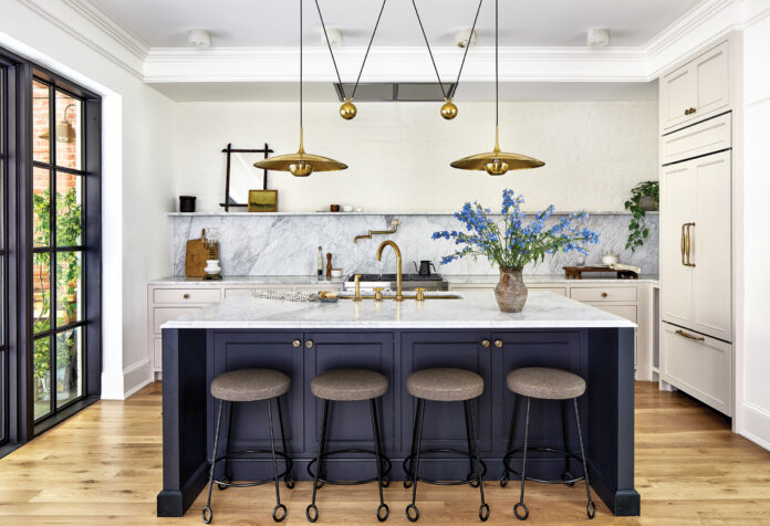 The home’s original galley kitchen was so narrow, tiny, and dated that Swabb knew it needed to be recreated elsewhere. The new kitchen, which offers a clear view of the backyard, was designed in partnership with Tanya Smith-Shiflett of Unique Kitchens and Baths. Swabb focused her budget on custom cabinetry and lighting to provide the biggest impact in the home. The Onos 55 double pendant lamp by Florian Schulz over the island paired with the Jean Royere Yo-Yo Counter Stool Reproductions add the subtle wow factor the designer was striving for.