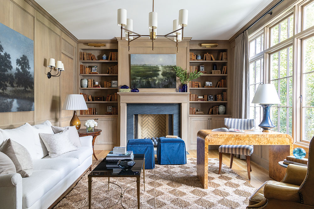 The study, known as the “adult room,” was designed as a respite from the Cheeks’ busy household. “I am a book lover and will jump at any chance to slip into this wood-paneled, intimate retreat by the fire,” notes the designer. “It took us a few tries to get the stain just right, but I’m so glad we took the time to play chemist because the result is timeless—not trendy—as wood stains can sometimes be.”