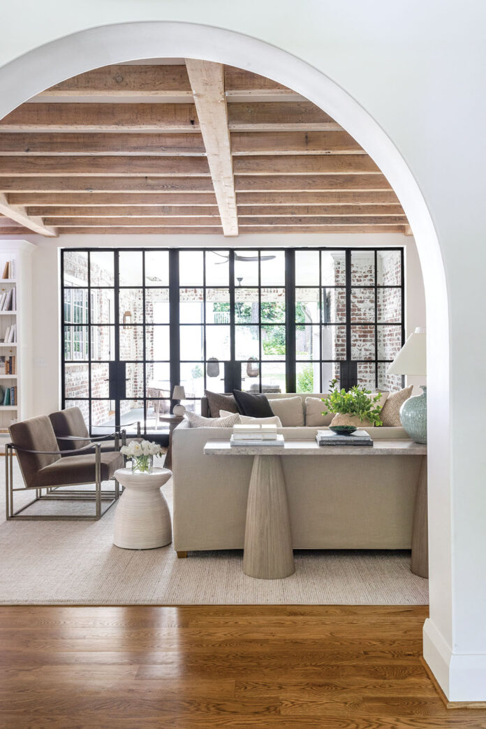 Avid entertainers, the couple loves using their porch for casual get-togethers, where guests can connect to the backyard. With multiple access points on every wall, they can serve drinks from a Dutch door off the wet bar or slip into the primary bedroom area to grab something easily. They often leave their iron garden doors open so visitors can see the outdoor splendor the minute they come through the front door. Inside and throughout their home, sea glass–hued ceramics and fresh beach-inspired embellishments juxtapose gracefully with raw, rustic accents, natural wood beams, oak cabinets, and iron details.