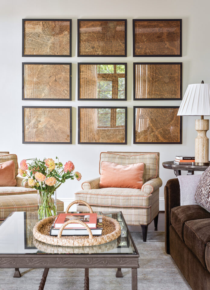 To accomplish the goal, only the stone accents, wooden beams, and existing mantels and kitchen range hood were left intact; everything else was removed, replaced, or reworked to freshen the home’s palette and presence. In particular, the relationship between his and hers is on display in the living room, where the fireplace surround and timber beams are paired with shapely, inviting furniture selections and salmon-hued accents, a color that was pulled from the stone and flows throughout the main gathering spaces. Similarly, in the keeping room, plaid chairs with tapered legs and piping and pillows in the same salmon color family illustrate the aesthetically pleasing juxtaposition.