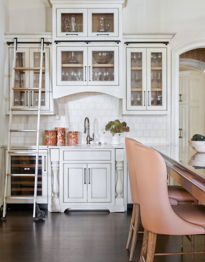Carving out an office that was feminine and tranquil was also a high priority, as the wife is a busy executive with an international company and frequently needs to take calls and complete projects at the property. While this room had to function well, it was equally important that it reflect her style and ultimately become a place she wanted to be. “This is her command station, but it’s also a place of refuge and a place of peace, so again, there’s no pattern,” Masters says, pointing to such features as the window seat and reading nook surrounded by built-in bookshelves, both of which seem to invite calm.
