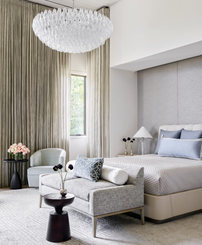 For the textiles, Booth assembled a mix of hardworking wool, chenille, and woven cotton fabrics and rugs with tone-on-tone patterns and rich textures that cannot only be felt but also seen. The neutral palette—comprised primarily of whites, blacks, and grays ranging in saturation and sheen from ash to charcoal and silver to steel—pops with hints of blue in such hues as slate and sapphire. According to the interior designer, keeping the color scheme quiet was the key to allowing his clients’ world-class art glass collection to sing.