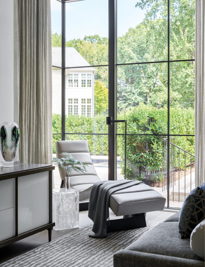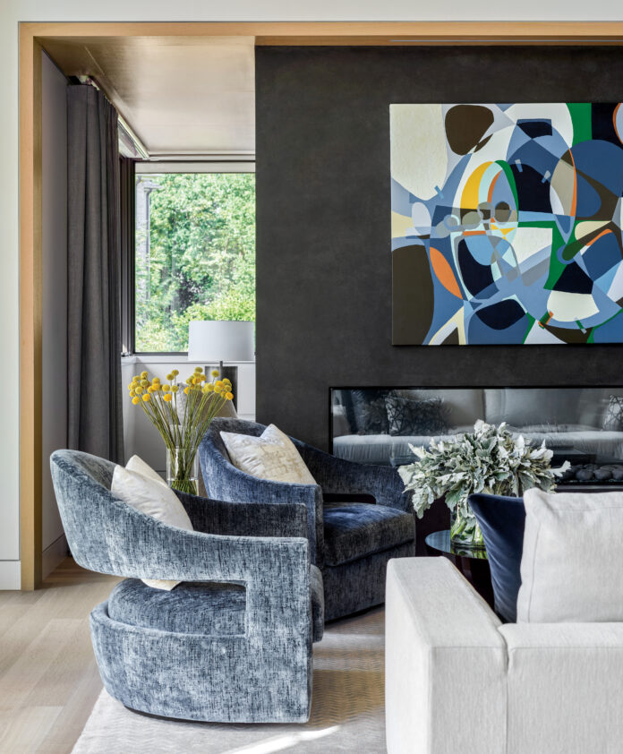 “Because it was a total departure from their previous home, my clients decided to start fresh when it came to the furniture and finishes,” Booth says. “They wanted a clean, contemporary aesthetic, but comfort was crucial. We prioritized scale and proportion and opted for pieces that allow you to curl up, sit crisscross, and even throw your legs over the arm of the sofa or chair because good furniture is the foundation for good conversation. It engages you and therefore encourages you to take time out to engage with others.”