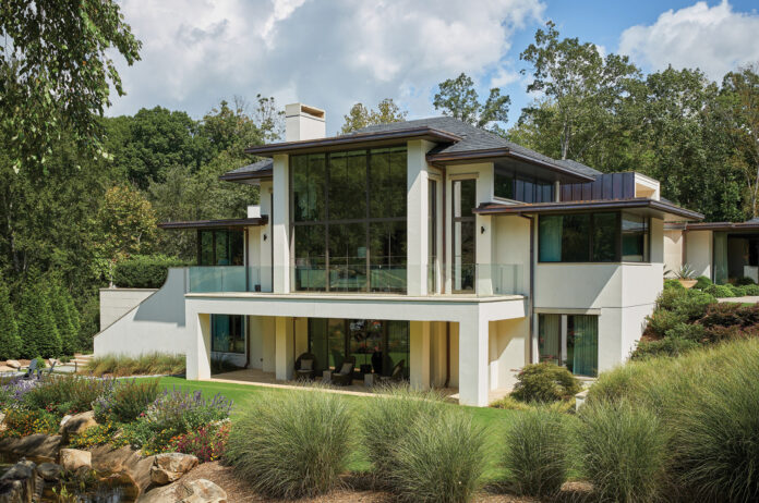 Located in a quiet gated community in Charlotte, the contemporary structure is heavily influenced by the sloped land upon which it stands. With a stream on one side, a waterfall to another, and dense woodlands to the back, the unique topography presented challenges that the architects ultimately channeled into brilliant design opportunities.