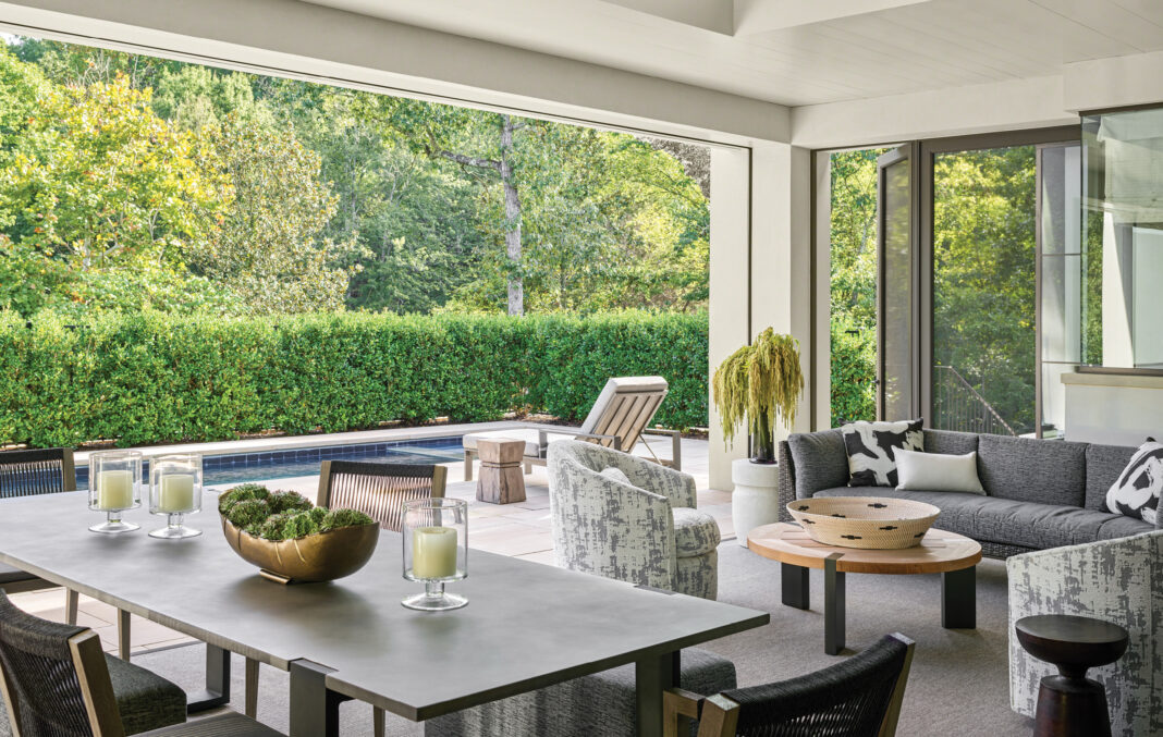 “In many ways, the design is a response to the site,” Pursley says. “We wanted the home to unfold in an unexpected way, revealing a series of architectural moments that are linked together to achieve an overarching experience of discovery. Moving onto the property, into the motor court and then through the dramatically scaled pivoting entry door, leaves a mental impression on visitors even before they have experienced the interior spaces.”