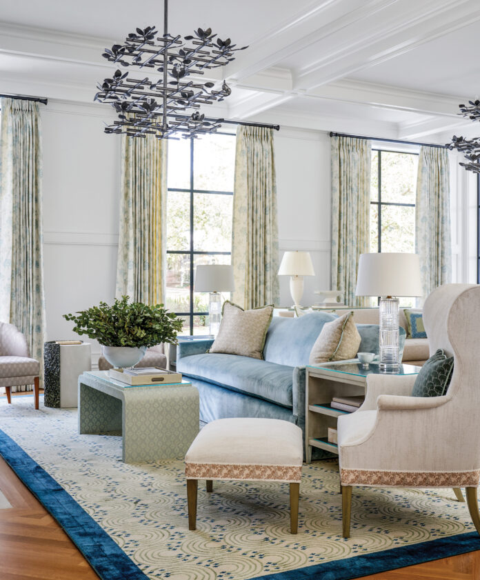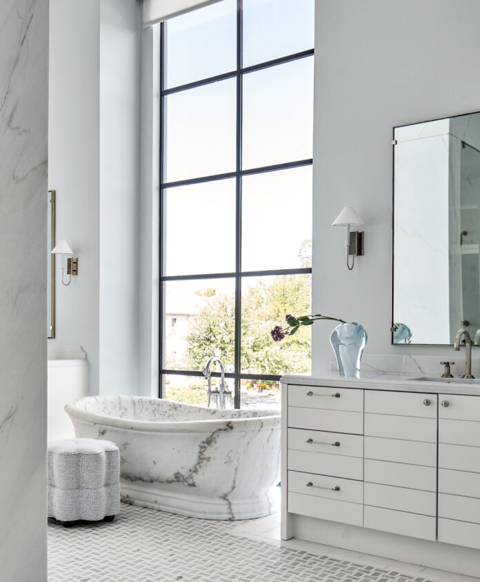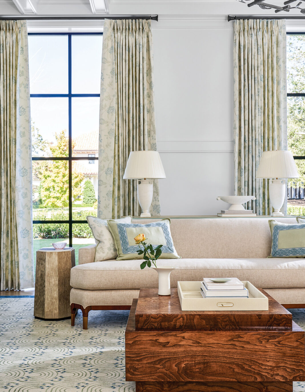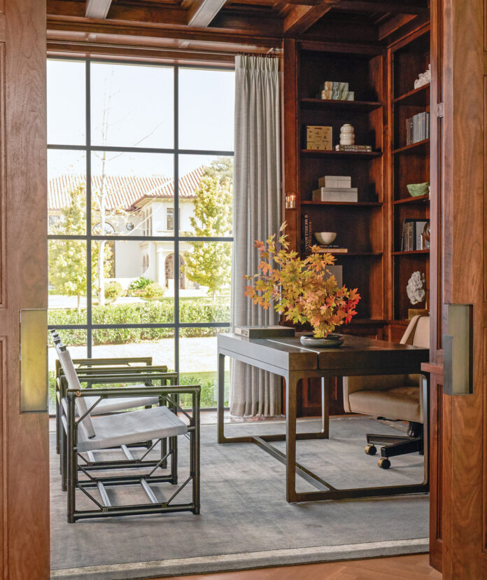 Steel windows open to the street, giving a view of the lantern-lined entry that leads past a wood-paneled gentleman’s study and into a large great room often used when entertaining. Here, multiple conversation areas offer an abundance of seating and seem to invite a crowd, while a light palette adds to the spacious feel. Further into the home, pocket doors allow these gathering spaces to be closed off from the kitchen and adjoining family room. Sander notes there’s also an indoor-outdoor moment, where glass doors fold back to connect this more private living space to the outdoors, thus extending the room’s footprint. “There’s green grass and a place to run, which is really perfect for them at this season of life,” she adds.