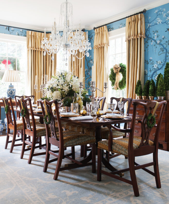 A vibrant chinoiserie mural, a lush floral centerpiece, and a boxwood wreath and topiaries combine to create an inviting dining experience.