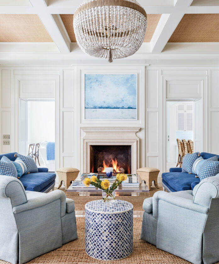 Encompassing nearly 5,000 square feet, the newly constructed residence displays a classic South Florida palette of pale blues, soft greens, and faded reds accented with crisp white walls and trim. “We used lots of performance fabrics, textured linens, sisal, and colors you would expect in Palm Beach to bring that sense of nostalgia and familiarity,” adds Kah. “The foyer, for instance, is clad in a Phillip Jeffries grasscloth that has texture but also a slight sheen. We loved the natural quality of this wallpaper, but it also felt elevated enough for the grand entrance, as it has a tiny bit of sparkle.”