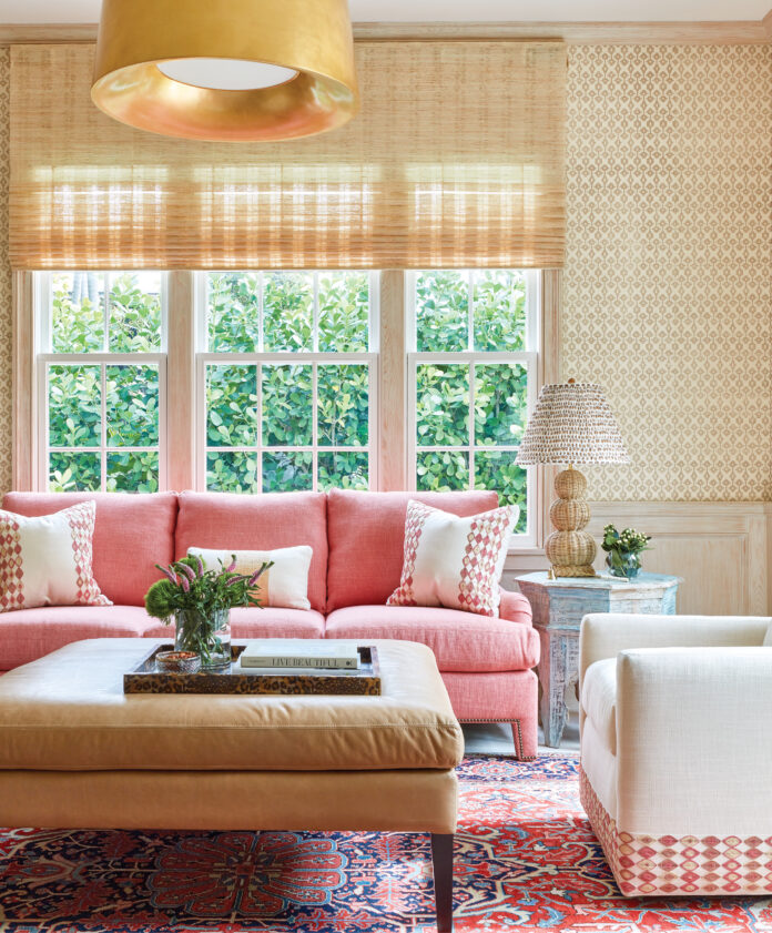 “The den/bar area just off the living room has to be my favorite space,” notes Kah. “Covered in pecky cypress and printed grasscloth, it includes a comfy, faded Nantucket Red sofa and bar tucked into a vestibule with an antique mirrored backsplash for a bit of shine. The couple are very sentimental, so we created a family gallery wall with bamboo frames to create an Old Florida feel.”