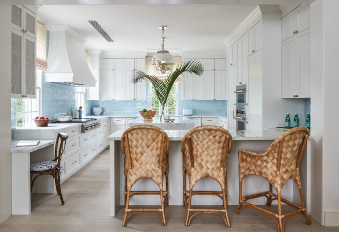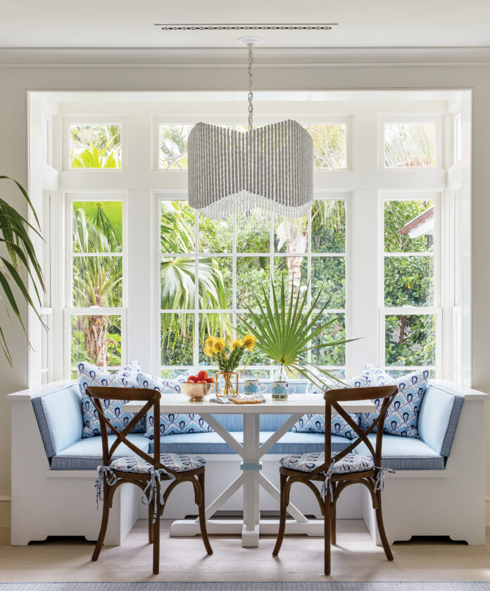 The kitchen and breakfast nook form the home’s central hub, where luminous pendant lighting inspires the design aesthetic. Overlooking the pool and guest house, this inviting space has become the family’s main hang, “and there is always someone here posting Instagram videos, doing Zoom calls, or enjoying lunch from Buccan—a well-known Palm Beach eatery,” says Kah.
