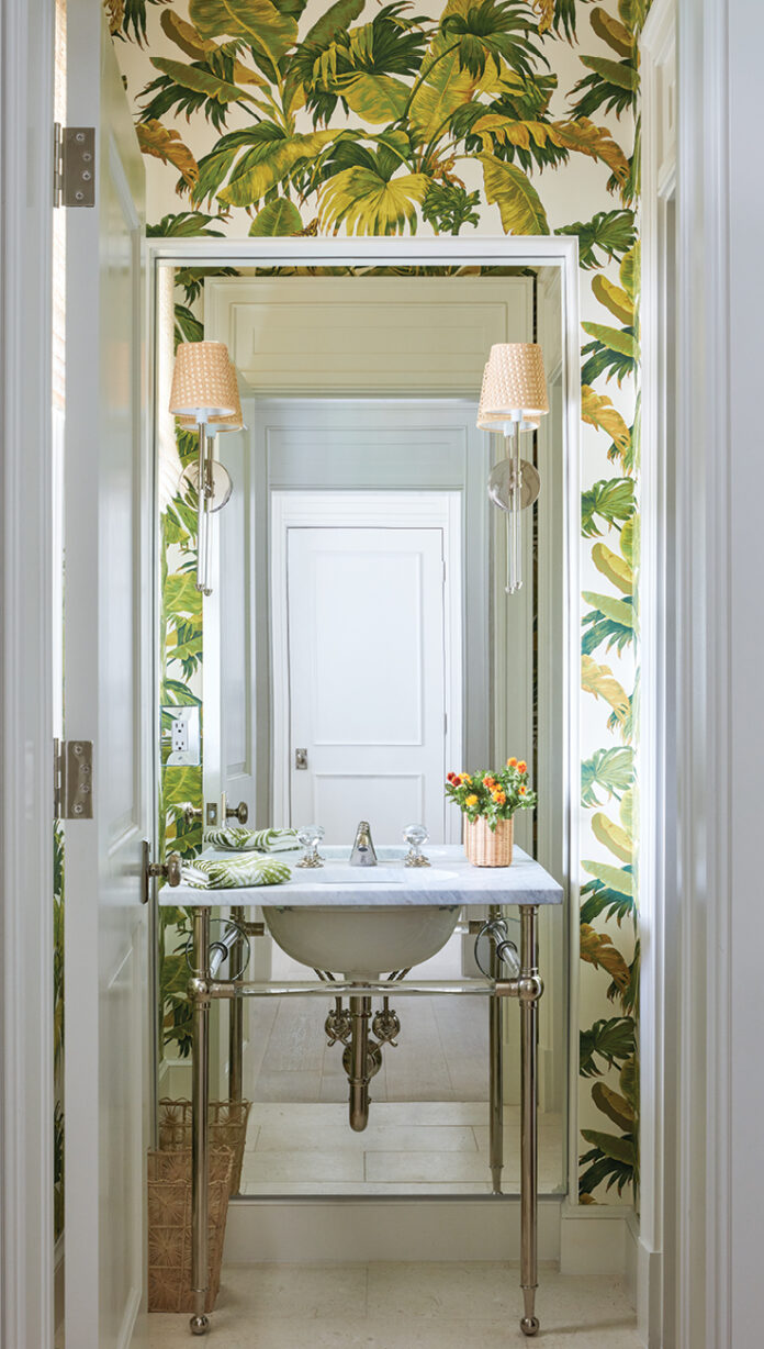 A quaint guesthouse embellished with a pecky cypress vaulted ceiling makes a cozy private escape for family and guests, with a hidden mirrored closet that reflects the pool views. Three distinctive guest bedrooms, defined with color palettes of green, pink, and blue, infuse an unexpected touch of Bahamian island style into the home, bringing a playful element to the refined aesthetic. “This couple loves to travel and has curated a collection of meaningful pieces through the years,” notes Kah. “One of my favorites is an antique chair we placed in the pink palm guest room that instantly created an esteemed counterbalance to an otherwise playful space.”