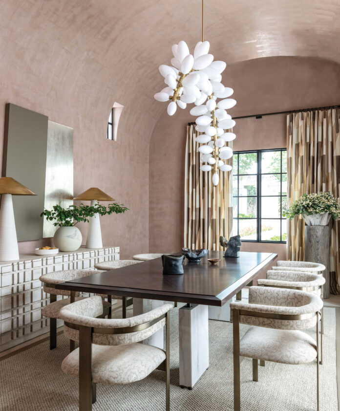 To this point, the home has numerous elevated features that are complemented with everyday elements. For example, the kitchen’s high-style cantilever island is as thoughtful in its form as it is sensible for informal dining. Overhead, the barrel ceiling is filled with a subtly shimmering tile, offering a moment of awe when gazing upward, while a separate banquette area, known as “the café,” gives a resting spot that is still within earshot of the cook and fellow diners. The primary suite and living room are neutral in nature but immensely rich in texture—a feature Nix notes is a must when working within a limited range of colors. Other rooms bear distinctive palettes, including the blue jewel-toned media room and the sophisticated formal dining room, where the plaster walls and ceiling are enveloped in a dusty rose shade.