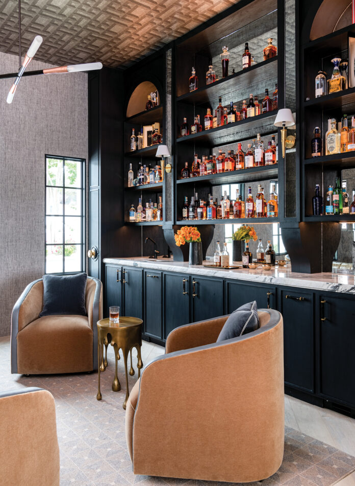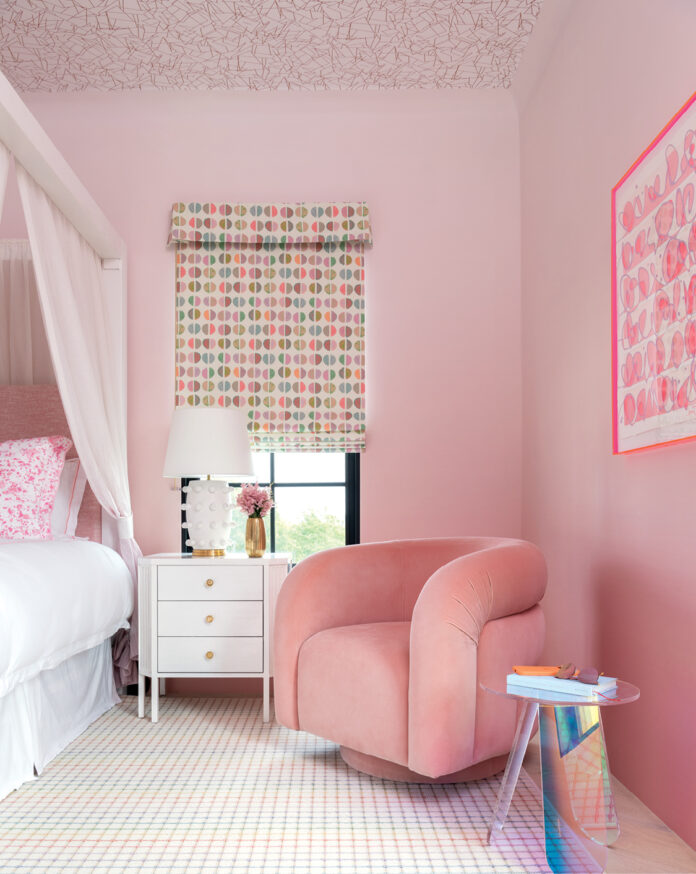 While colors define some of the aforementioned rooms, many of the home’s most personal spaces were designed with a particular family member in mind. For example, the spacious bar was customized for the husband. “He was like a kid in a candy store,” Nix says of the scene when it came time to organize and prominently display its offerings. For her, a space under the stairs that was formerly a wine room was transformed into a shoe and handbag closet. “This was a better use of space for them and gave her more storage,” Nix notes. Since the closet lacks natural light, the designer infused it with soft neutrals that bounce light along with a gold ceiling treatment that is functionally chic. Upstairs, individualized bedrooms play to the couple’s daughters’ love of pink, while hues of blue and a serpent-patterned wallpaper are a match for their son. What Nix refers to as the “rock ’n’ roll playroom” is a teen-friendly lounge area complete with a lacquer wallcovering on the ceiling, framed photographs of modern rock icons, and even a disco ball, all of which point to Nix’s love of completing a home down to the most client-inspired details.