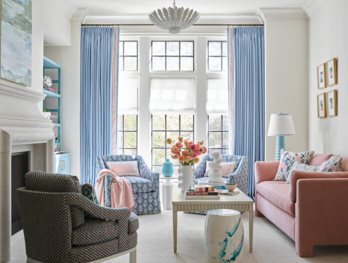 Kleiner approaches color by choosing what she refers to as “hero” fabrics that form the jumping off point for much of the palette. “One was the dining chair fabric with its dusty pink background, green and white squiggles, and some varied colored dots, and my client said whatever you want to do around that, I am fine!” says the designer. A pillow fabric on the pink sofa in the living room also played a role. “It has a yummy candy color vibe with pale aqua, grass green, blush pink, and a pale apricot that we drew from,” says Kleiner.