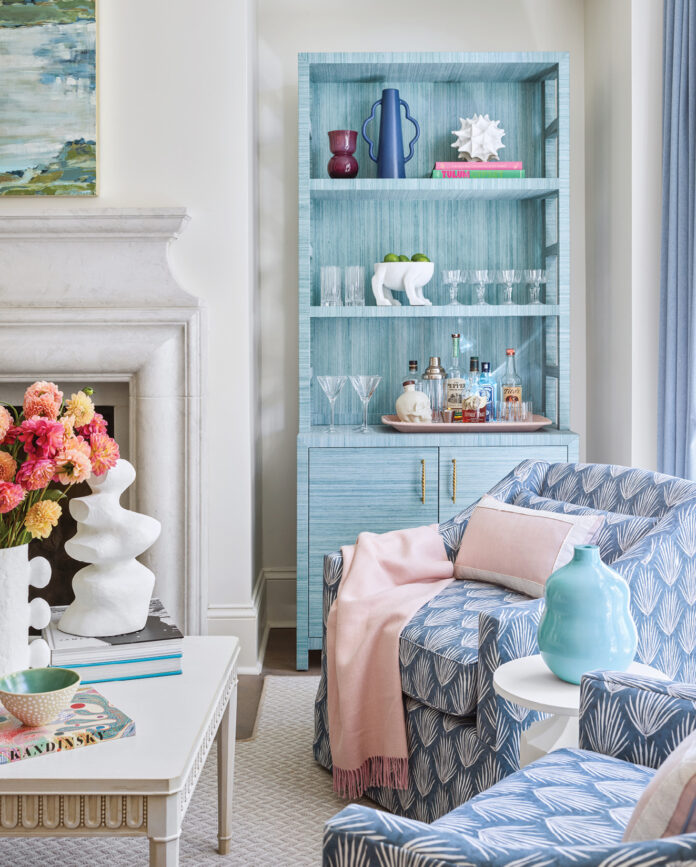 The designer and her client picked out art early in the process, and those choices further informed the palette. “Rather on a whim, I sent her the work of a photographer I love that features food in a larger-than-life kind of way,” says Kleiner. The image, with bright pink macarons on a vivid blue background with miniatures, captured her client’s fancy. “I just love it and love the name,” says the homeowner. “It’s called Macaron Incident. People will come in and glance at it and then later take a closer look and burst out laughing because it’s so tongue in cheek.”
