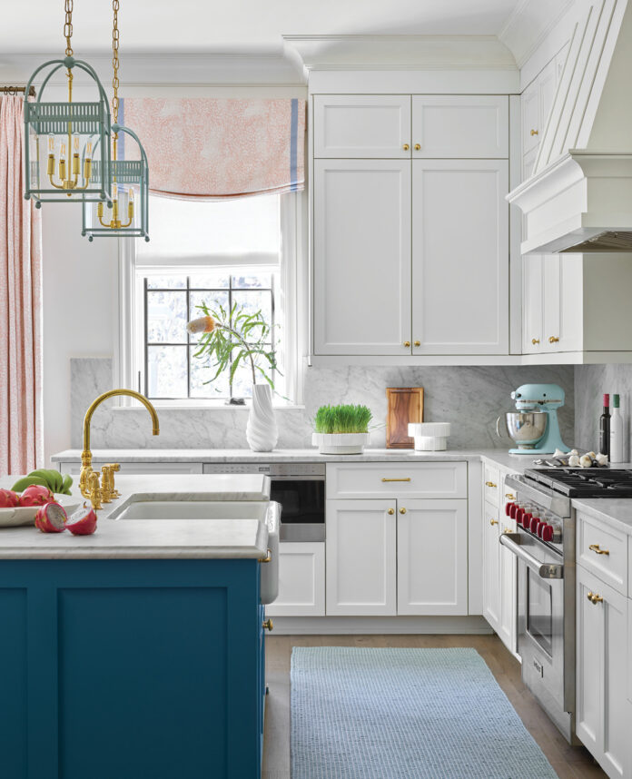 Likewise, the rug selections are on the quiet side to provide a backdrop for all the art, color, and prints. “This house is so light and scrumptious, I didn’t want to use any dark-colored rugs.” Because the dining room also serves as a connecting space, her client was worried about having a rug there at all, but Kleiner introduced a winning compromise—an indoor/outdoor rug from Perennials. “It’s just such a beautiful pattern, and it’s so soft when you step on it,” she says. In the primary bedroom, Kleiner introduced a thistle-colored wool broadloom rug to impart a softness to the hardwood floors. A pale aqua blue runner brings texture to the kitchen. The entire design speaks to the power of color but also the importance of thoughtful editing. “Everything is just so beautiful,” says the homeowner. “Even though my home is colorful, it’s actually very relaxing.