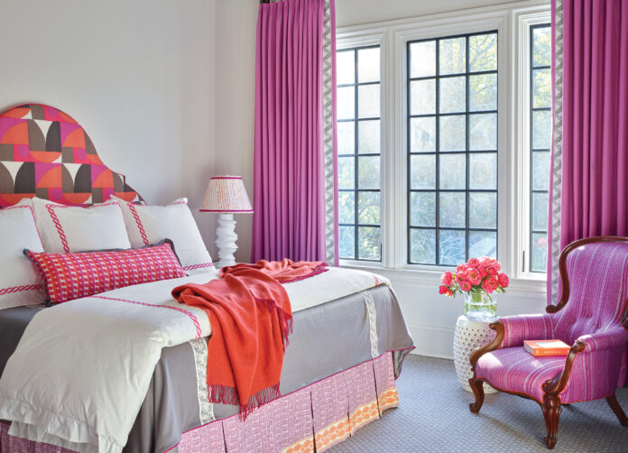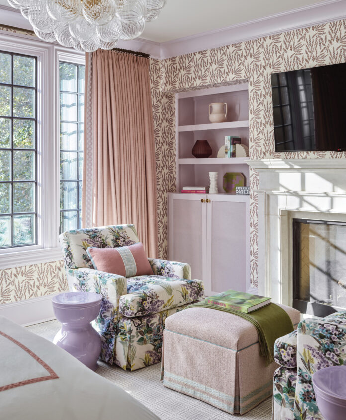 For her client’s bedroom, Kleiner went in a slightly different direction. “The colors in her bedroom are a little offbeat from downstairs. We twisted things a bit to be a little moodier and murkier,” says the designer. “The lighter pink from downstairs exists as a thread, but we added a rich caramel/olive green tone along with dusty lilacs and purple hues with gray undertones.”