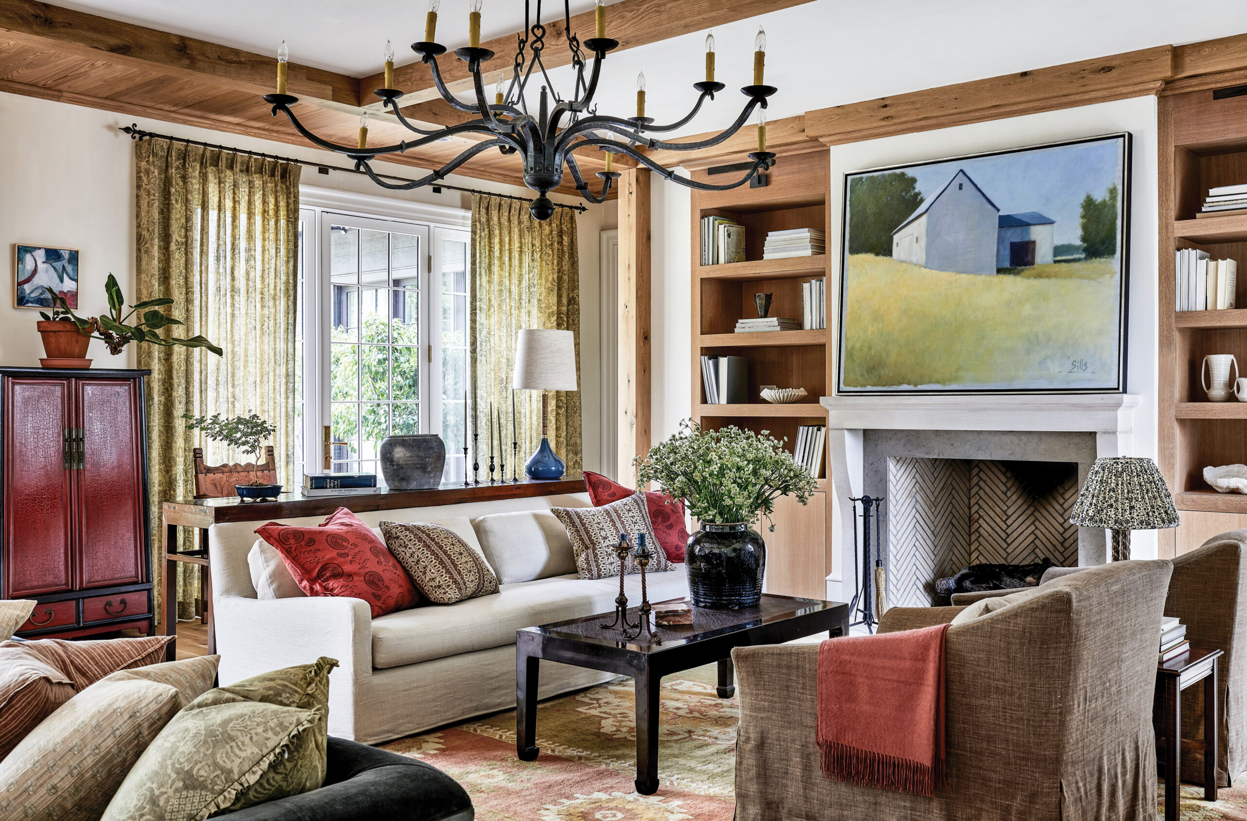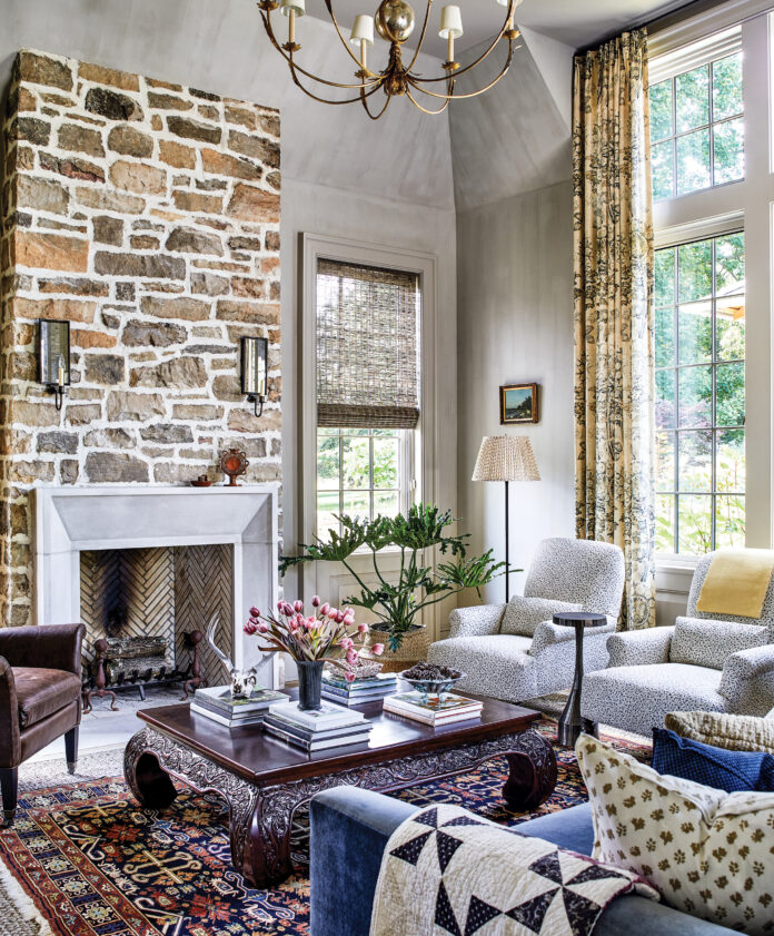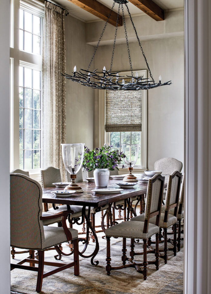 “Melissa understood our cleaner, more organic aesthetic, and she also embraced our desire to incorporate all the varied treasures we had collected over the decades without it looking like an international market!” says Rhodes. “A Chinese cabinet found a home in the living room; a huge carved Thai table serves as a coffee table in the den; and our Oriental rugs are sprinkled and layered throughout,” notes Rhodes. “The interiors feel both refined and Virginia farmhouse in the best way.”