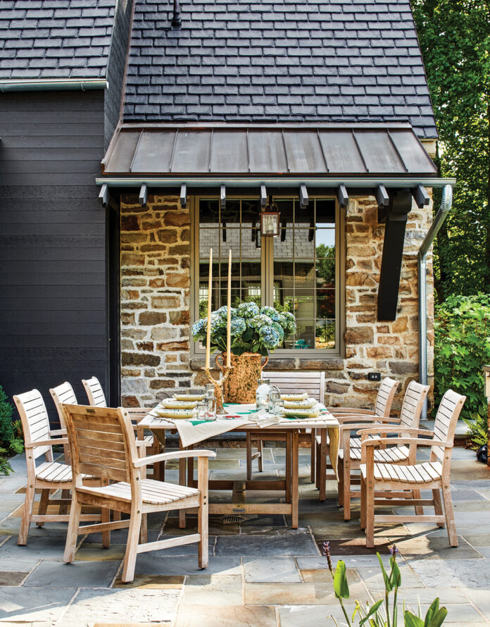 We call it faux country,” says Sheri Rhodes with a laugh when describing her and husband John’s home in Great Falls, Virginia. “It’s close to everything and is basically a suburb of D.C., but most importantly, the four-season experience drew us back after years in other locations, including Texas and Asia.” The Rhodeses found a rare five-acre property ideal for their plan to revel in rural pursuits, including gardening and beekeeping, but also to simply experience an indoor/outdoor lifestyle where native wildlife appear on regular basis. Great attention was paid to the siting of the home by architect Patrick Cooke of Thomson & Cooke Architects and Joseph Richardson of Richardson & Associates Landscape Architecture.