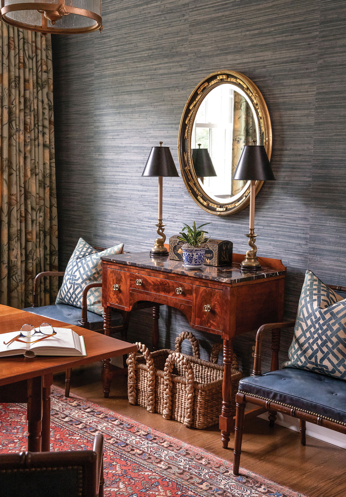 ER: I want my rooms to be luxurious, layered, and approachable and to look like they’ve been here forever. After all, what good is luxury without comfort? I put draperies in every room and usually start with a statement print. I like antiques with new upholstery. Antique upholstered pieces are generally too low to the ground and too shallow to be comfortable. I love antique Persian rugs. They immediately communicate good taste and a sense of history. Persian rugs also wear like iron, so you don’t have to treat them as if they are precious.