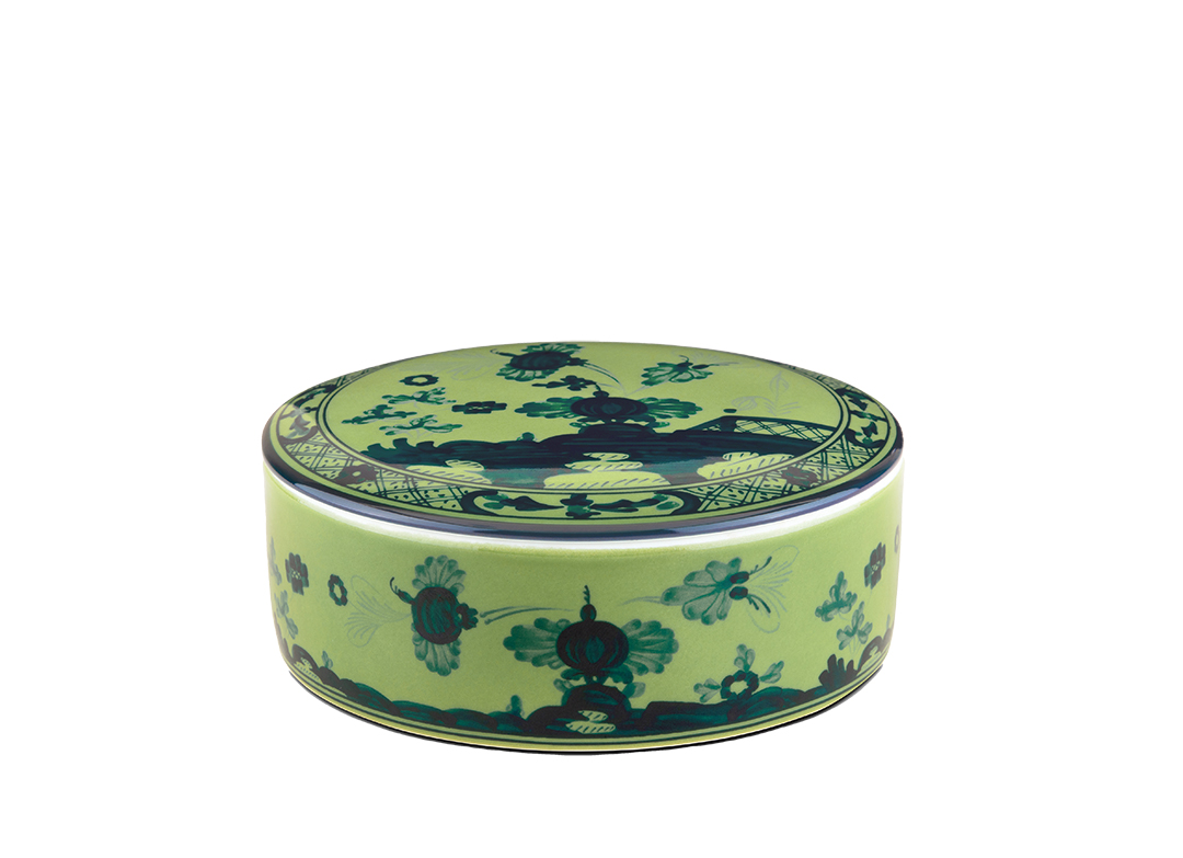 TRINKET BOX IN MALACHITE FROM THE ORIENTE ITALIANO COLLECTION BY GINORI 1735; a beautifully crafted porcelain box adds an element of understated luxury; $235; ginori1735.com