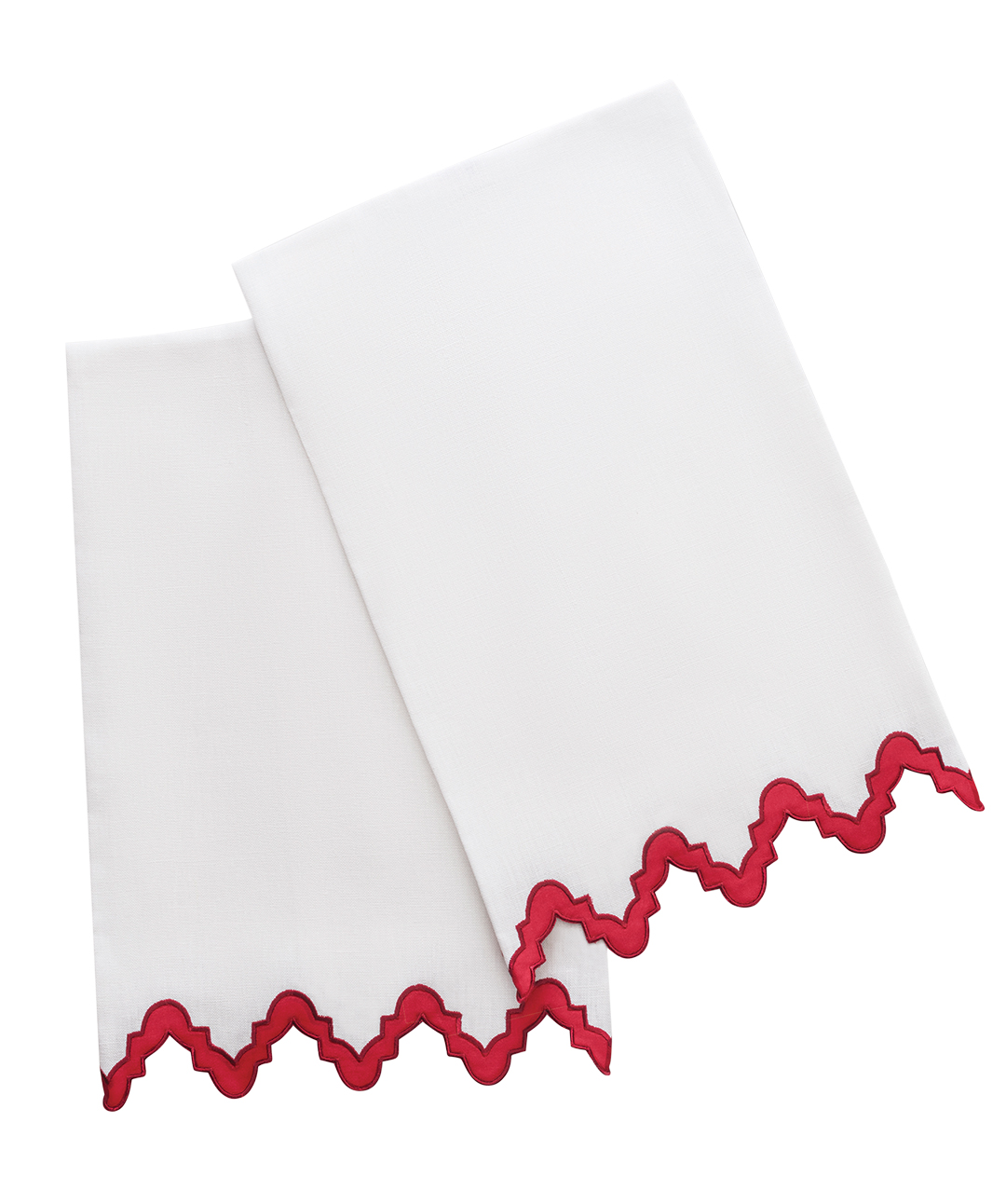 AZIZA GUEST TOWELS BY MATOUK; a zigzag appliqué on linen brings distinctive design to everyday moments; set of 2, $225; matouk.com