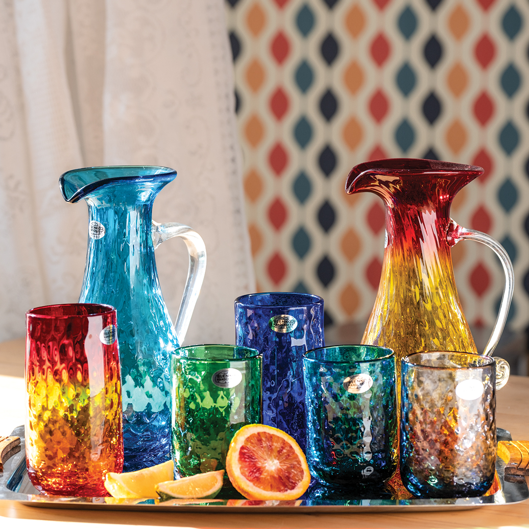 DIAMOND OPTIC PITCHER AND TUMBLERS BY BLENKO; hand-blown glass by skilled artisans in West Virginia to create a work of art; starting at $62; blenko.com