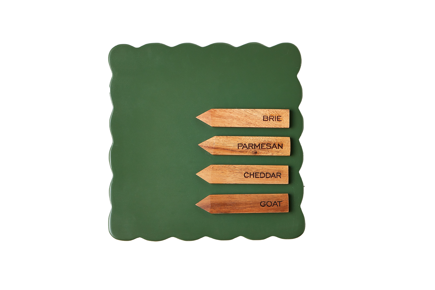 SCALLOPED BOARD WITH CHEESE MARKERS BY ETU HOME; bring old-world charm to modern entertaining; $48; etuhome.com