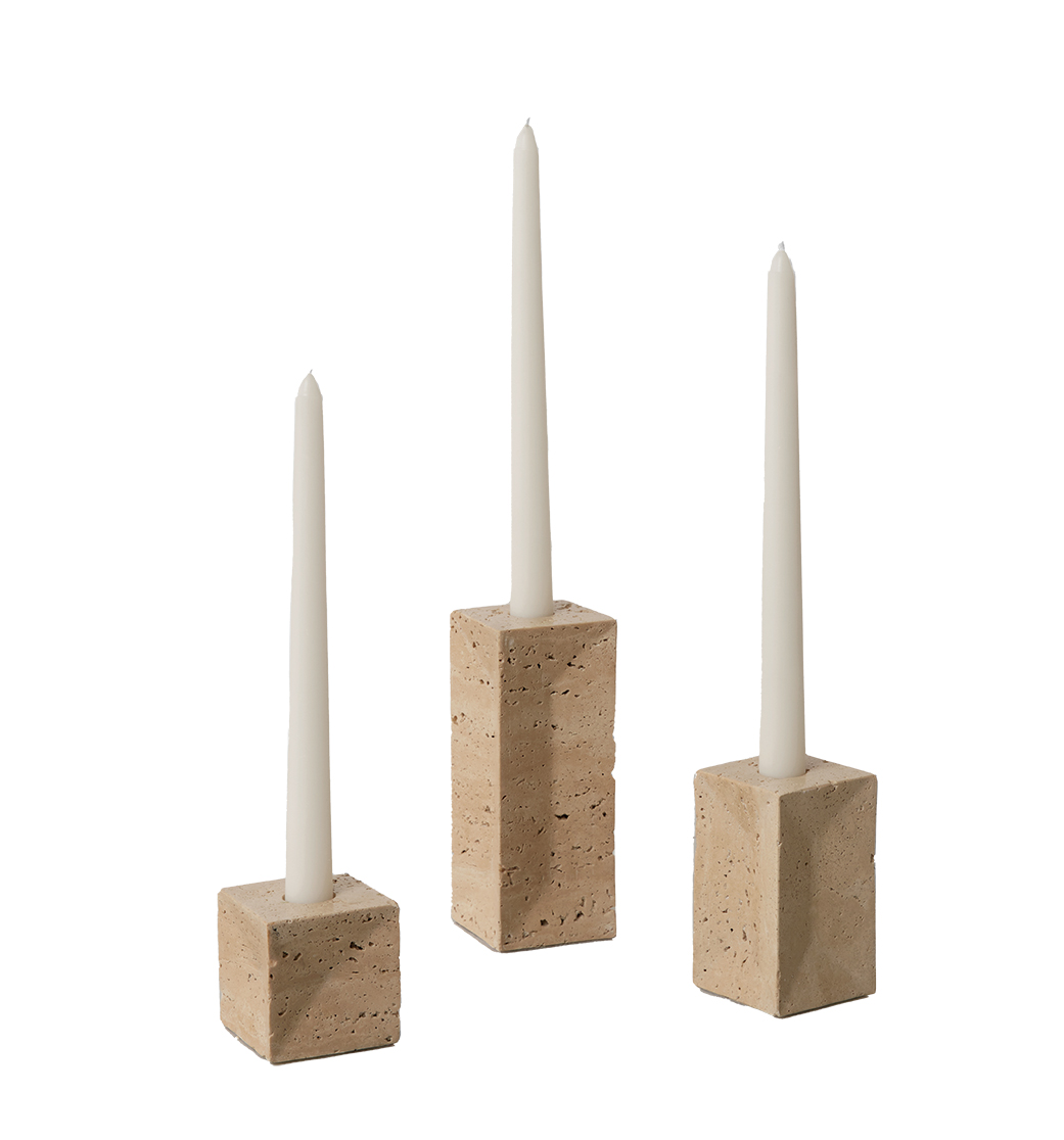 TRAVERTINO CANDLE HOLDERS BY SFERRA; the natural beauty of travertine with clean lines and neutral palette; set of 3, $140; sferra.com