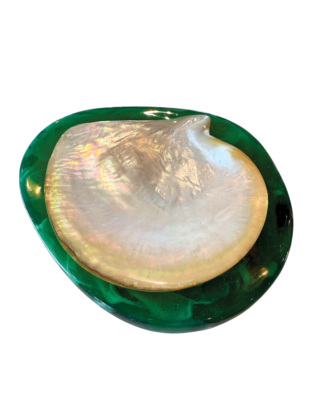 ROUND CAVIAR SERVER IN GREEN BY GOURMET GIRLS; a sculptural dish for elegant entertaining; $238; gourmetgirlsbr.com