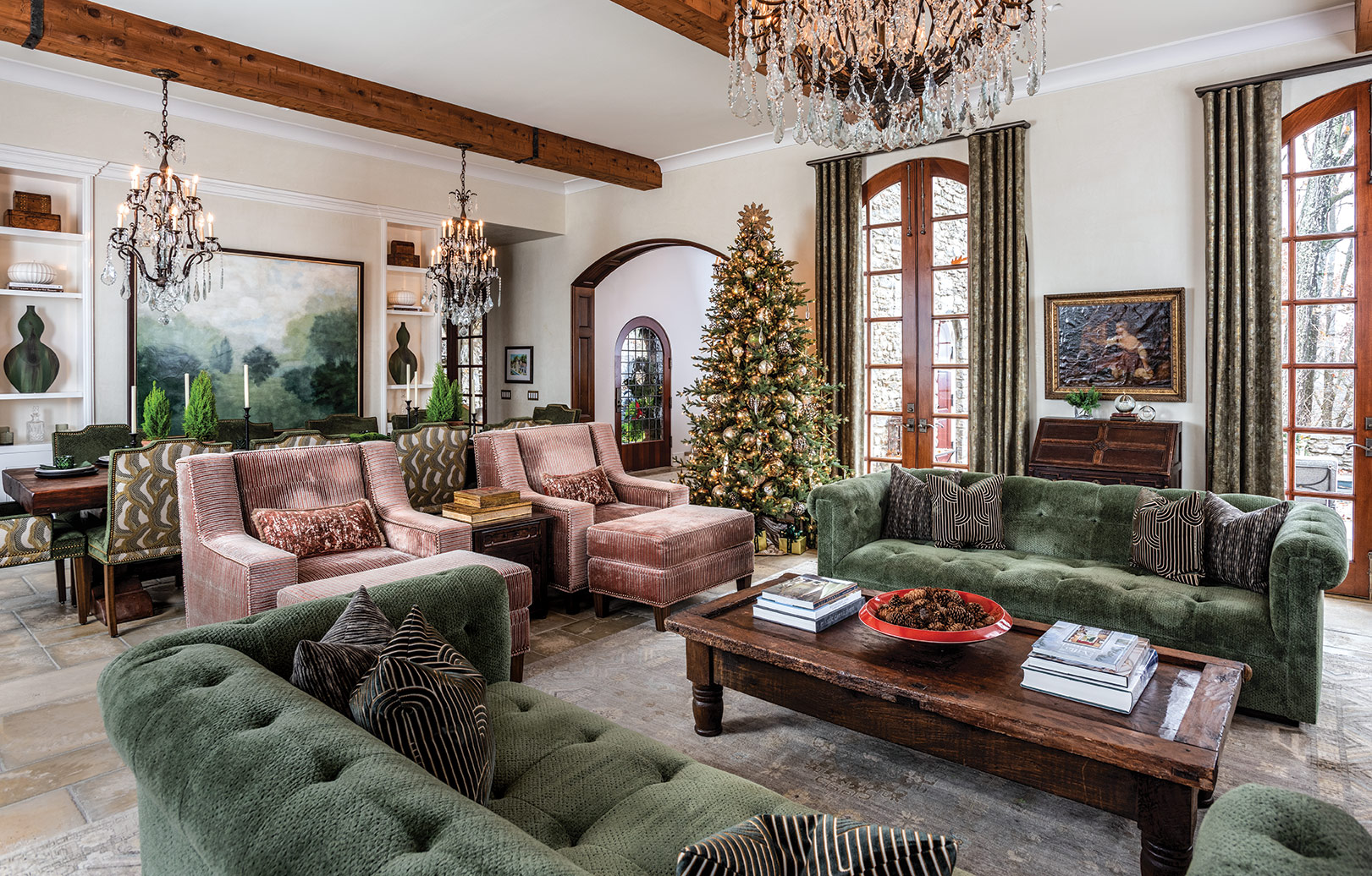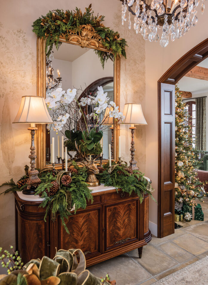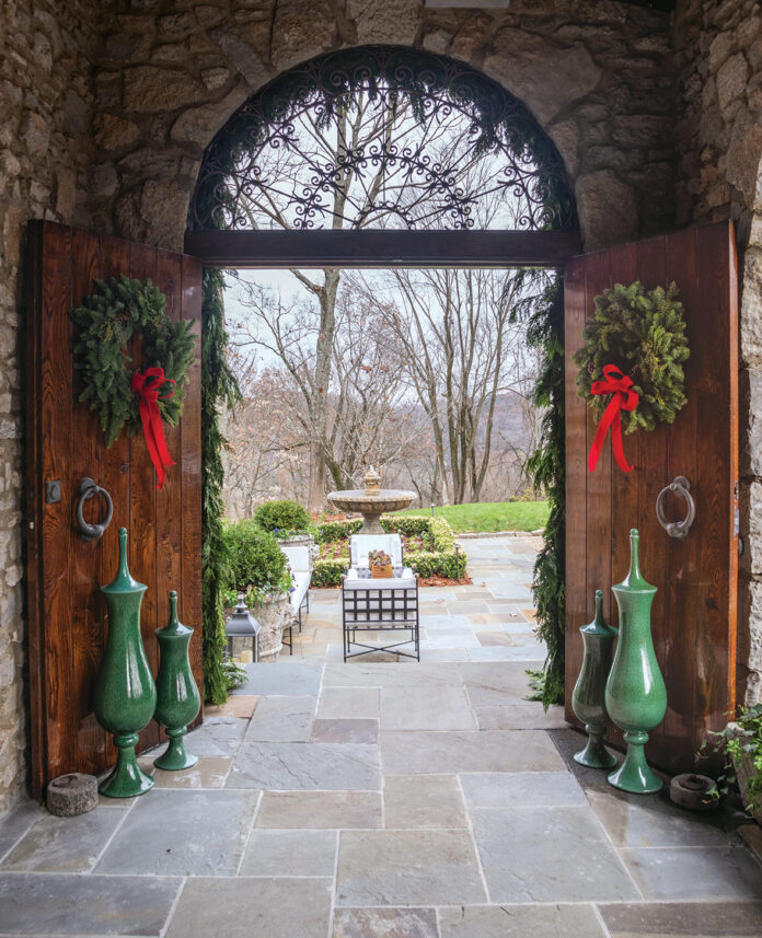 “In the game room, or what we call the Razorback Room, we integrated the family’s traditional ornaments, as well as blown-glass ornaments, to generate a more classic Christmas feel,” says Todd. “The couple also displays an elaborate Charles Dickens snow village, lending a timeless European feel while keeping family traditions alive.” Outside, lavish greenery and beribboned wreaths adorn the arched stone passageways leading into the house.