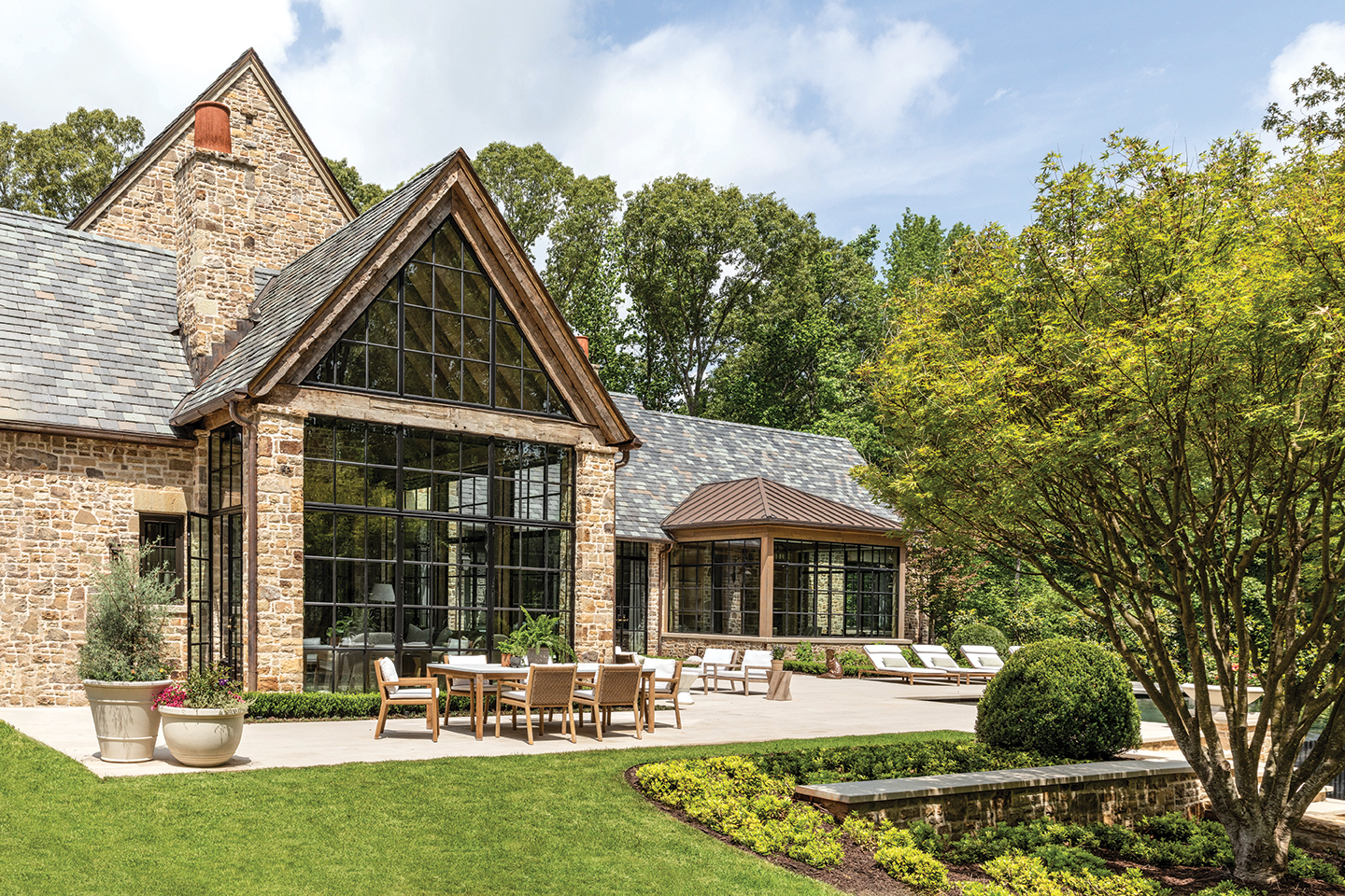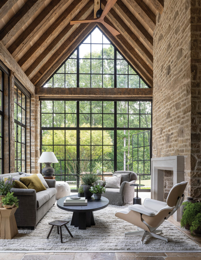 Mindful of the setting—a neighborhood with acreage-sized lots that feel set apart from the world—the architect began to develop a structure that connects the indoors to the out. This is especially evident in the great room, which is lined with steel doors, creating a seamless connection between the interior, the garden, and the pool terrace. “Throughout the day, the dynamic and experience of the room change as the light changes,” Adams says. “This concept of centering life around the pool and terrace was applied to all main living areas, creating an indoor-outdoor experience that serves as the heart of the home and brings everyone together,” he adds. Similarly, Adams connected the two homesites with a bridge that crosses the small creek along the footpath, making it easy for the family to go back and forth between the two residences. The use of natural elements on the exterior, such as Tennessee fieldstone, oak, and Vermont slate, also make the structure feel like an extension of its environment.