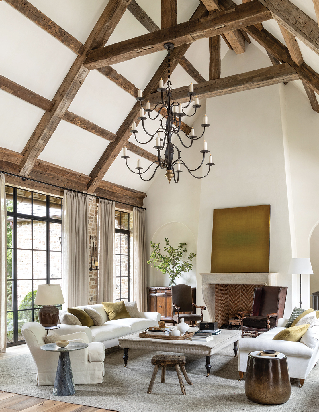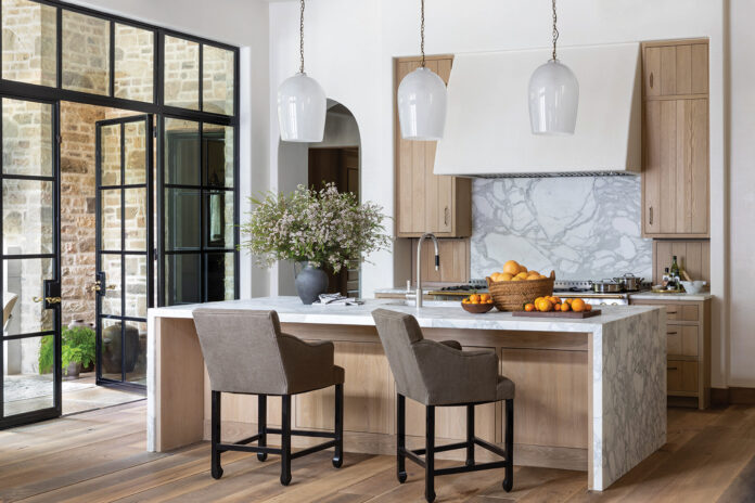 Westbrook notes the home’s strong architecture also plays heavily into the interior presence. “Tim is so good with scale,” she says, pointing out features such as the arched doorways that frame glimpses of a room from a hallway and the vaulted, beam-adorned ceilings. Adams also drew the kitchen plan with crossover between him and Westbrook on finishes. “It’s very important to us that we are an asset to the architect and builder,” Westbrook says of the relationship.