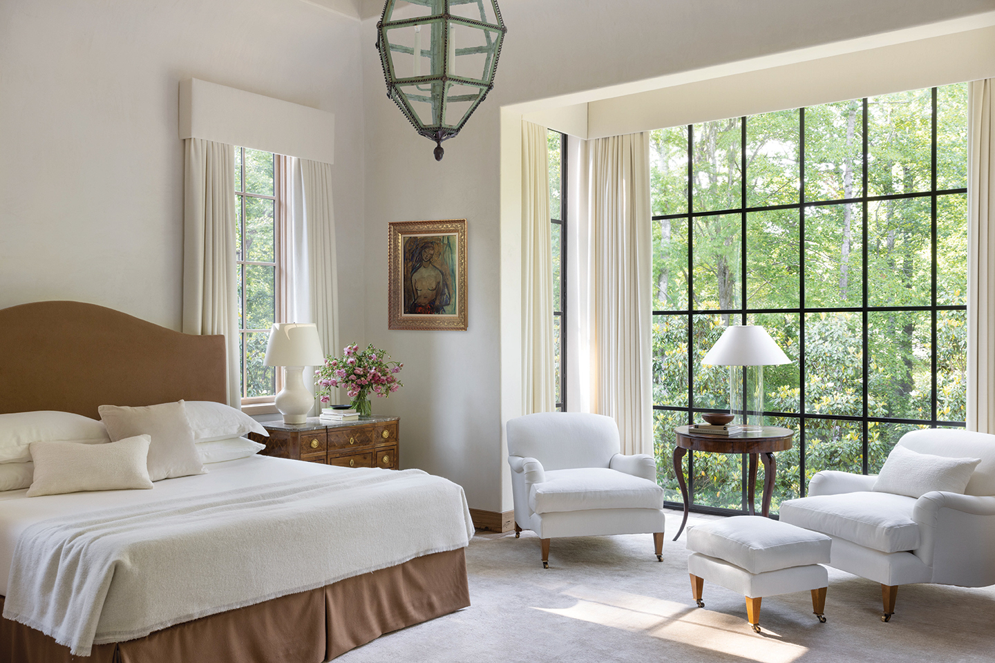 Indoors, this refined selection of materials continues with Belgian minimalism influencing much of the design. Adams referred the owners to interior designer Barbara Westbrook, whose office is located on the same Atlanta street as his. Westbrook and lead designer for the project, Amanda Leibson, worked with the couple to create cohesive spaces that play into the desire to connect the home and grounds while giving it a character reflective of the family. A design book enthusiast, the client brought inspiration from London designer Rose Uniacke and Belgian architect Vincent Van Duysen. “She likes a current look that still has a foot in traditional design,” Westbrook says, noting that the client is drawn to antiques. “It’s a relaxed house that is beautiful but not overcrowded with stuff,” the designer explains. “There are casual pieces mixed in with formal, but there’s nothing fussy about it.”