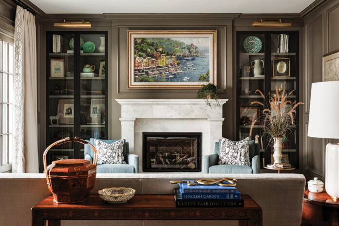 Safeguarding the home’s rich architectural heritage was a primary goal. The team restored classical symmetry, designed multilayered moldings to match original trim, added period-appropriate wainscoting and paneling, and sourced historic door hardware to match the home’s surviving pieces. “We helped the family decide what to keep and what to part with during an estate sale at their previous home and drew furniture layouts to fit keepsake antiques into the new home,” says Foley. “We also designated places to display collected artifacts from the family’s world travels.”