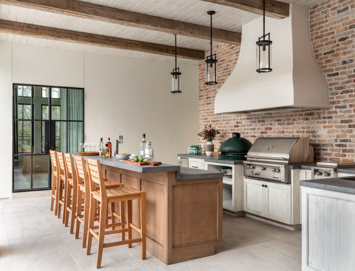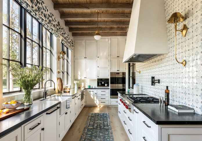Progress was slow, especially during the COVID-related building shortages, but steady, resulting in a stunning six-bedroom, 9,240-square-foot Cape Dutch–style home, blending traditional materials, such as whitewashed stucco, brick, and wood, with modern elements, including large-scale steel-and-glass windows and doors.