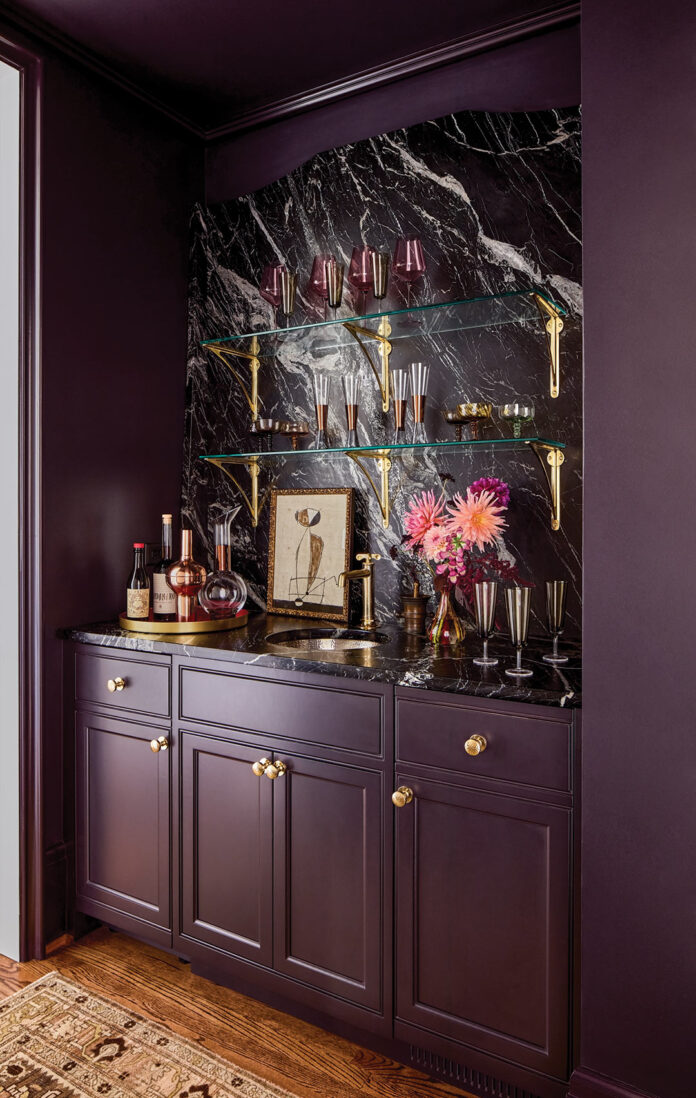 A welcome change of pace from the usual open floor plans desired by younger families, the wife requested a separation between spaces so she could have a more traditional layout with a dedicated dining room, living room, and kitchen. “I love the charm and special features that can be added when rooms are separated,” says Neely. “Vintage wooden pieces mixed with handsome velvets and feminine florals gave each room a collected feel. Wallpaper in the dining room embraces the custom curved walls of the space—it feels like a hug when you walk in.”