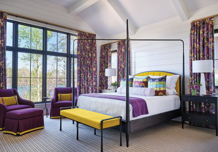 “Our shared love of color really shaped the design of this home,” says Johnson, who presented bold-hued options to her clients for every room. In the great room—the heart of the home’s gathering spaces—she installed custom magenta chandeliers from Stray Dog Designs. Their dramatic hue plays beautifully against the rustic oak beams, pristine white tongue-and-groove ceiling, and crisp white shiplap walls with the lake beyond as a counterpart to the overall palette. “With a neutral background, you can truly play with color and find a balance,” Johnson explains. “The subdued backdrop gives the eye a place to rest, and then vibrant details, such as the chandeliers, draw it around the room,” she says, celebrating each special piece within a cohesive whole.