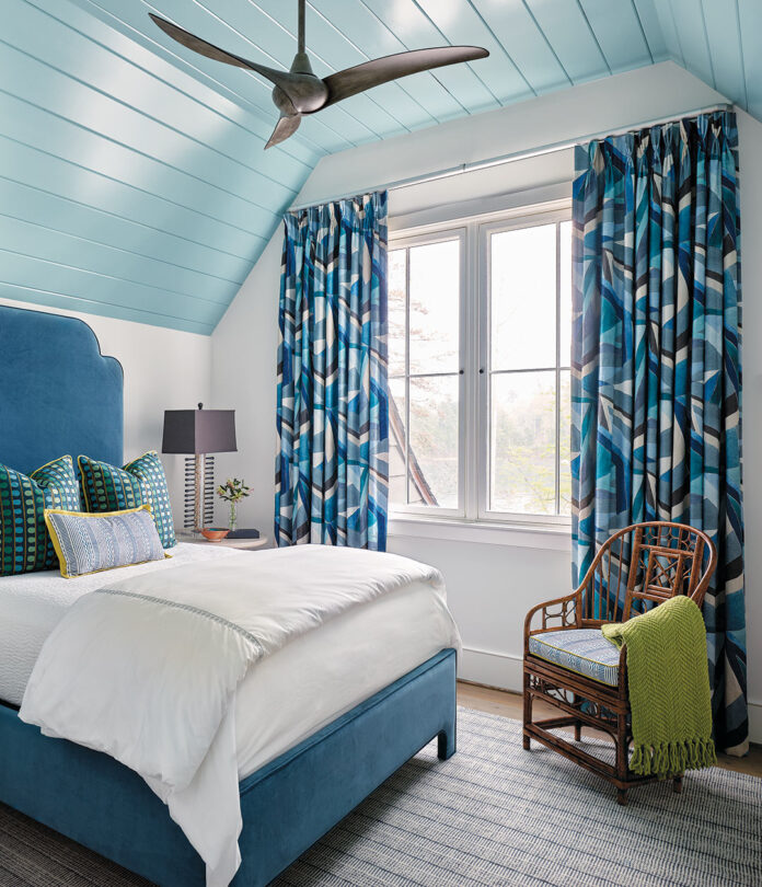 That philosophy is on full display in the foyer, where grand black steel-framed glass doors usher guests toward an antique chest crowned by a contemporary glass orb installation. The interplay of old and new, of timeworn character against crisp modern lines and pops of color, creates an inviting, atmospheric entry that immediately draws the eye toward a captivating lake view beyond. In one guest bedroom, a rich mix of antiques and artwork sets a collected tone, enlivened by fresh fabrics that give the space a distinctly current feel. Johnson paired heirloom pieces—including a vintage bench and chair—with a lively assortment of brightly colored folk art. “It’s a warmer counterpoint to the cooler palette found throughout the rest of the house,” she notes.